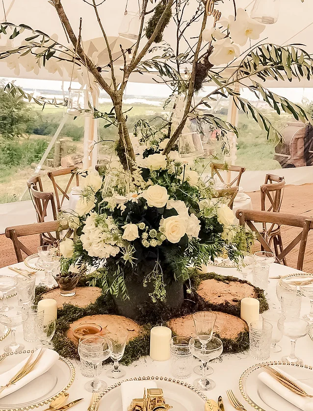 Wooden circle tables seating 8 guests.